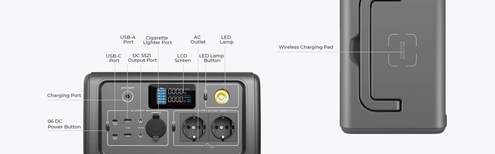 | Output Ports | 2 x AC Output:220-240v 1000W In Total2 x USB-A Output:5V 3A2 x USB Type-C PD Outputs:100W1 x Car Port:DC 12V 10A2 x DC Outputs:12V 10A 5 5mm x 2 1mm1 x Wireless Charging Pad:15W |
