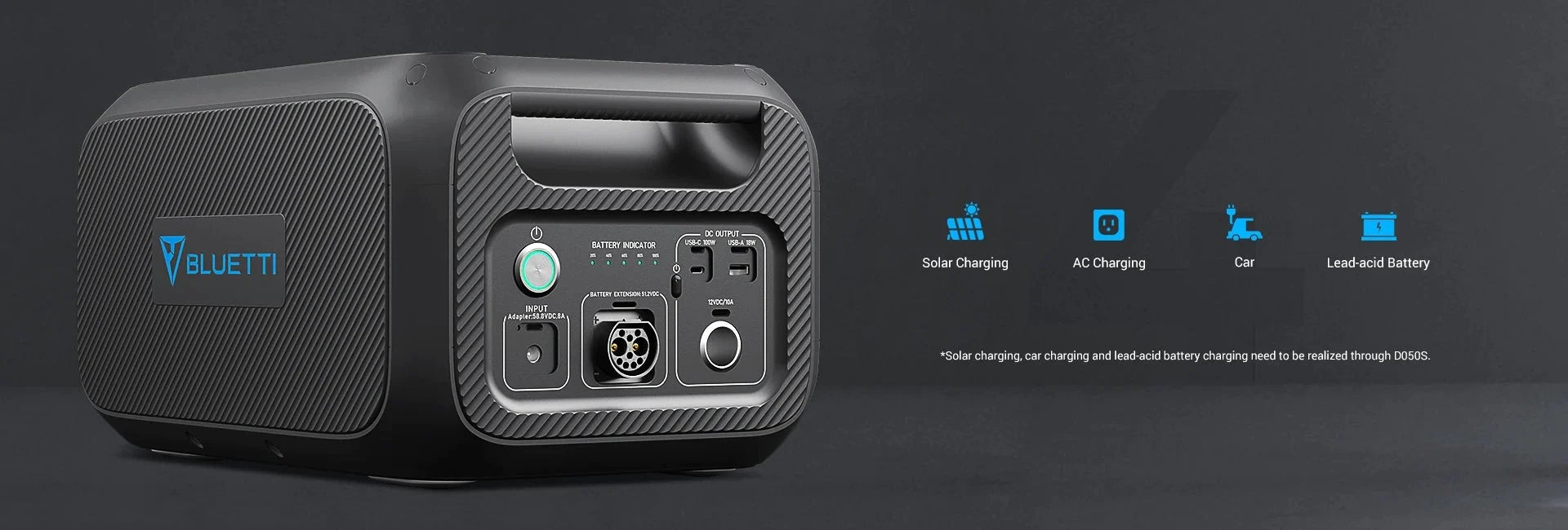 | Input | AC Adapter Input:500W Max.Solar Input:500W Max. VOC 12-60VDC 10A (Via BLUETTI D050S)Car Input:12/24V from Cigarette Lighter Port (Via BLUETTI D050S)Lead-acid battery:12/24V from Cigarette Lighter Port (Via BLUETTI D050S)Max Input:500W |