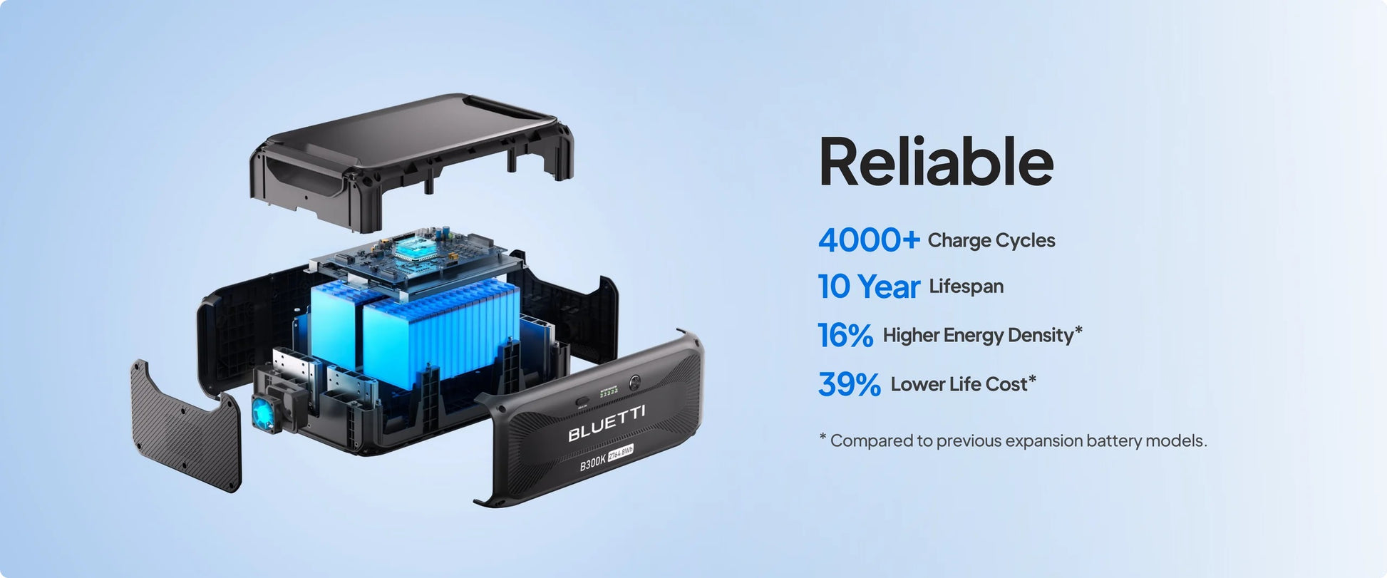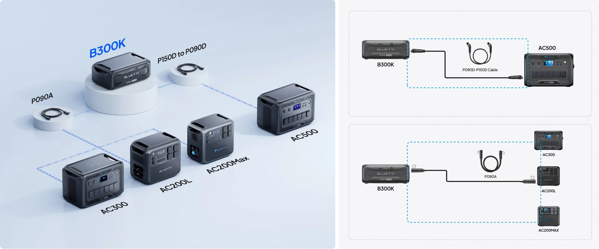 | Επιπρόσθετα | Extended lifespan with automotive-grade LiFePOand#8324; battery.Compatible with BLUETTI AC200L / AC200MAX / AC300 / AC500.16.588Wh max capacity while connecting with AC500.P090D to P150D cable is required for connecting with AC500 and sold separately.3+1 years worry-free warranty (Register for extension:Product Registration).Built-in USB-A port to charge your devices conveniently. |