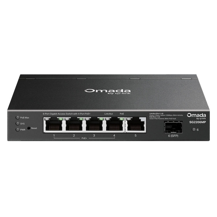 | Επιπρόσθετα | 5and#215; Gigabit RJ45 ports (4and#215; PoE+) and 1and#215; Gigabit SFP slot 63W total PoE budget with up to 30W for each PoE+ port* Centralized cloud management via the web or the Omada app† Standalone management via web CLI SNMP and RMON Static Routing helps route internal traffic for higher efficiency VLAN ACL QoS and IGMP Snooping Durable metal casing and desktop/wall mounting design |